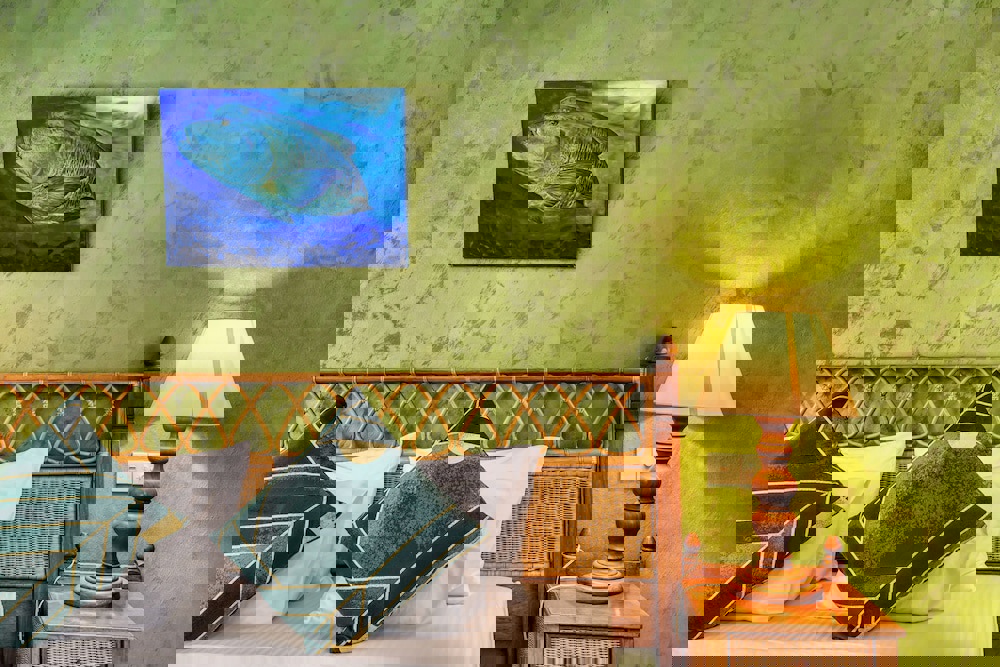 the restaurant embraces the island spirit with expansive windows showcasing