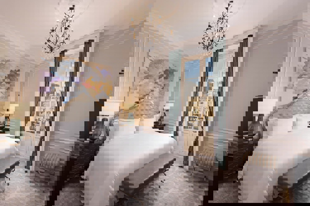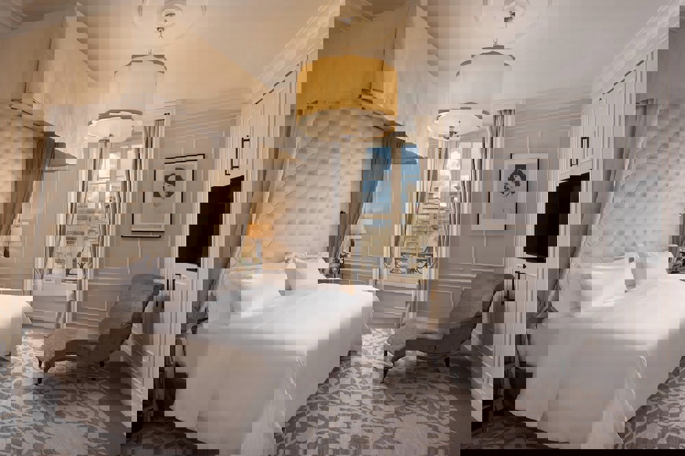 1 king Luxury Collection bed or 2 twin beds. City or sea views. 430 square feet (40 square meters). Gray leather headboard set against a feature wall of purple, green and blue splashes. Marble-topped tables. Purple brocade curtains. River views from French windows. Walls and fabrics in gray, white, and purple. Bathroom with marble floors and surfaces (black-veined marble from the Pyrenees), double sinks, hairdryer, make-up mirror, heated towel rail, and separate rooms with bidets and lavatories. Chaise longue. Wooden desk with designer lamp. Individually controlled air conditioning, minibar, and laptop-size safe.