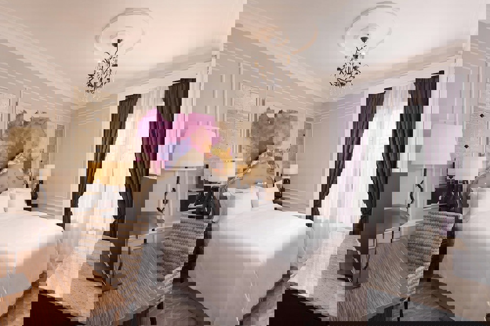 1 king Luxury Collection bed or 2 twin beds. 40 square meters. Feather duvet. Purple brocade curtains. Historical gilt-framed prints. Crystal drop chandelier. Purple glass bedside lamps. Concealed reading lamps. Walls and fabrics in purple, gray, and white. Wireless Internet access (surcharge). Bathroom with marble floors and surfaces, double sinks, hairdryer, make-up mirror, heated towel rail, deep soaking tub, rainfall showerhead. Wooden desk with designer lamp and cordless phone. Individually controlled air conditioning, minibar, and laptop-size safes.