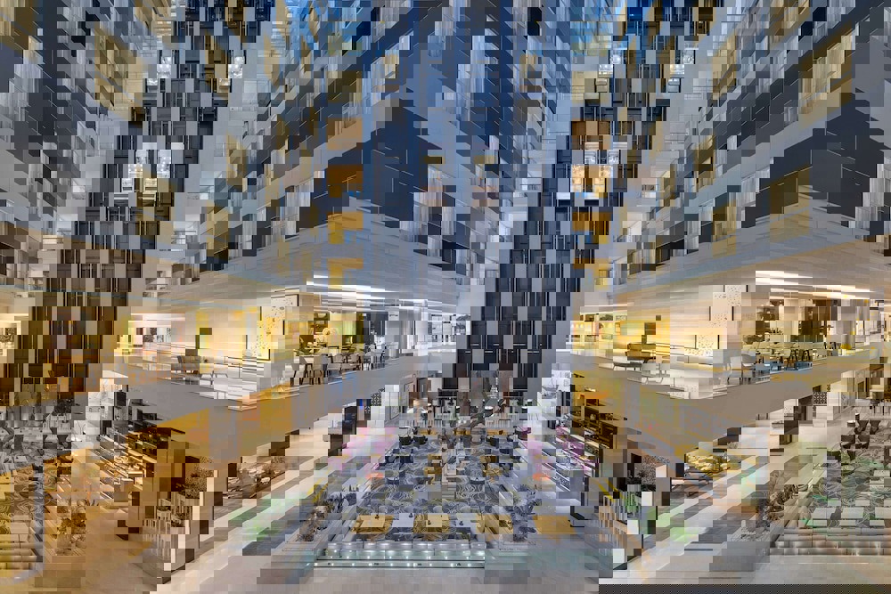 the ground level beneath a stunning atrium and illuminated by natural sunlight,