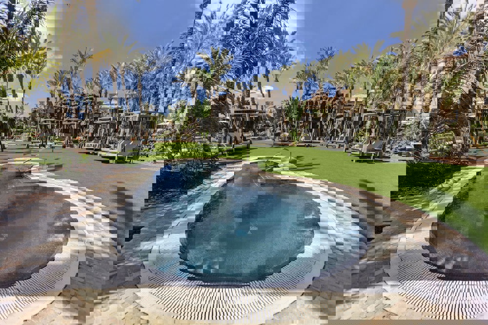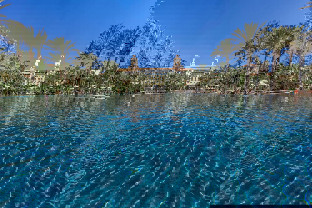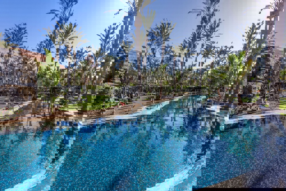 As soon as we arrive at this Resort in Gran Canaria, we are greeted by a majestic palace. Its windows, doors and porches take visitors back to the colonial era, so typical of the architecture of the Islands. Once through the entrance, the more than 2,000 palm trees that guide us to our room make us feel in an oasis in the middle of this desert landscape of dunes that disappear into the sea.