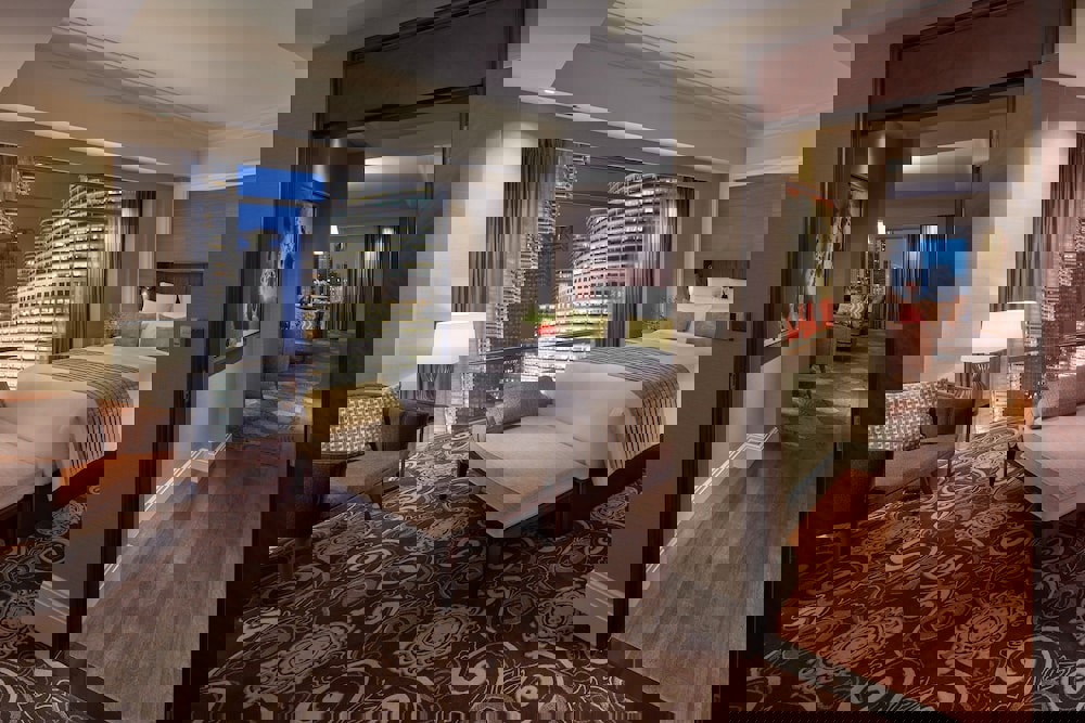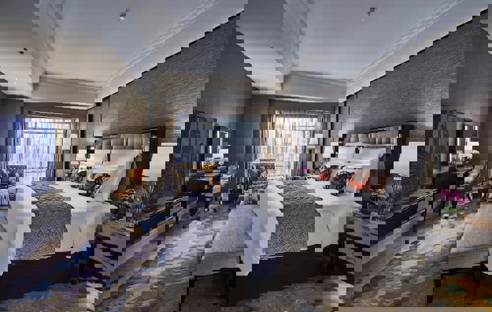 One king bed. 82 square meters (882 square feet). Views of KLCC Park. Separate lounge, dining area, and guest washroom. Contemporary, Asian-influenced decor with a glass-topped desk, a dark-wood credenza, and Malaysian-inspired artwork. DVD/CD player, minibar, in-room safe, and coffeemaker. Fax machine, complimentary wired and wireless Internet access, and two multi-line phones with voice mail. Yellow-marble bathroom with a deep tub and separate shower, black-marble vanity, bathrobes, slippers, and live plants. Complimentary turndown service, daily newspapers, and mineral water.