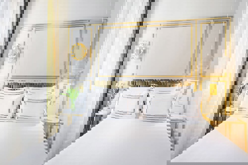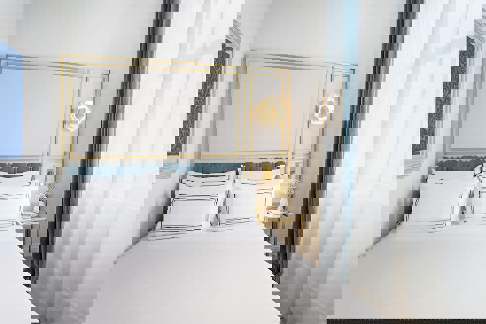 Experience an elegantly serene design in a comfortably assembled room of 16 m². The modern tones of blue, white and gold combined with marble furniture and opulent decor deliver an unforgettable stay. The Deluxe rooms come with a welcoming double bed, en-suite bathrooms and luxurious amenities.