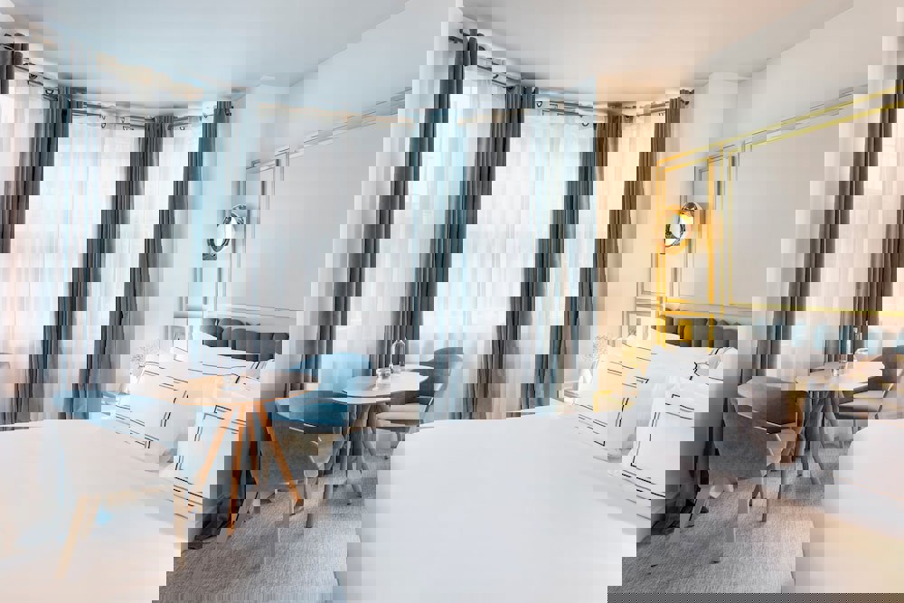 Be welcomed into the calming space of a 21 m² Premium Room. The modern design of blue, white and gold tones perfectly compliment the marble furniture to create an environment that will relax and recharge you. Our Premium Rooms are furnished with a double bed, pristine en-suite bathrooms and luxury amenities.