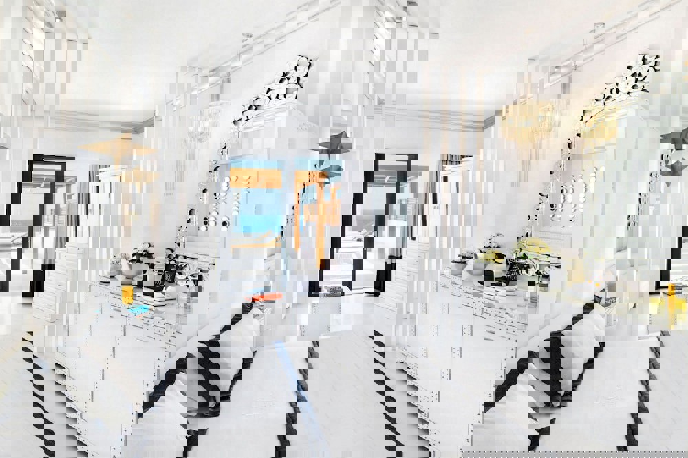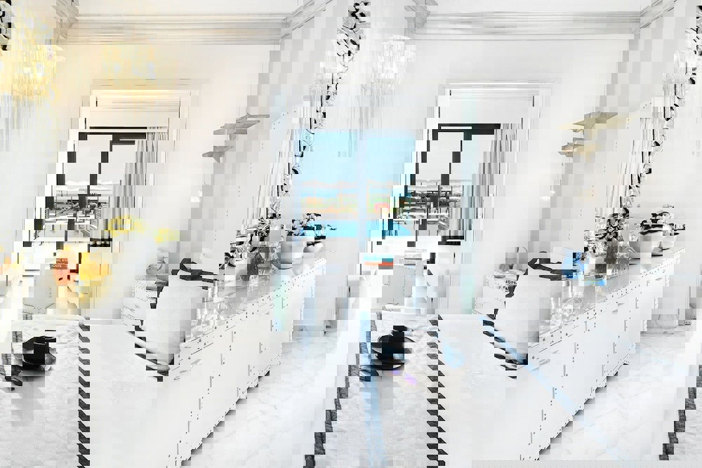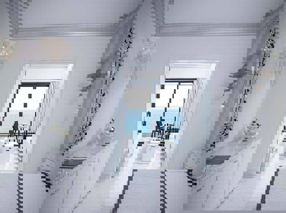 Presidential Suite Jacuzzi Sea View – approx. 70 m2; 1 separate bedroom with 2 bathrooms & 1 living room (max 2+2 pax: 1 double bed & 2 sofa beds): standard accommodation facilities & services plus outdoor thermal Spa-whirlpool, kitchenette (fully equipped), extra AC unit, 70 m2 terrace (with umbrella & sunbeds & separated balcony in each room), DVD player, brand-name bathroom amenities, daily in-room champagne & macarons (18:00-20:00), priority reservation at the restaurants