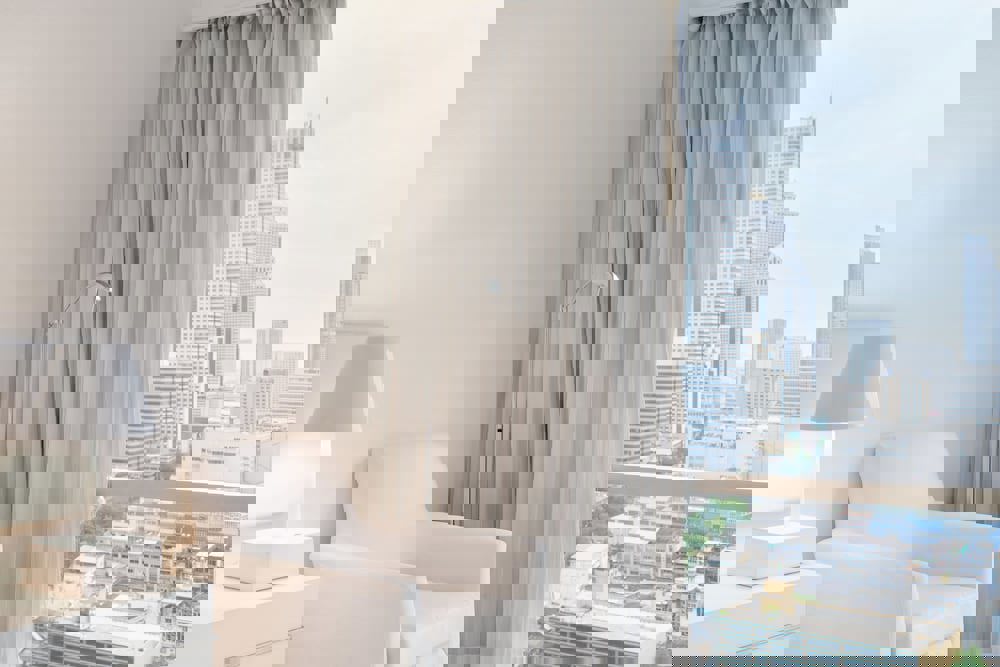 the Chong Nonsi BTS station. Rooms feature panoramic views of Bangkok through