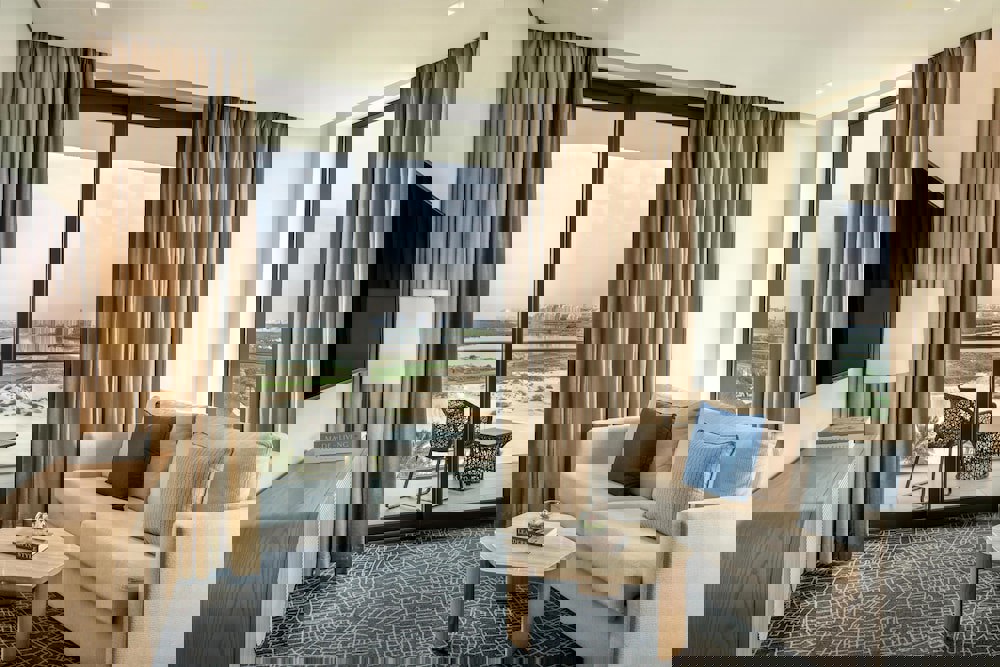 views of the lush Yas Links Golf Course and the pristine blue waters of the